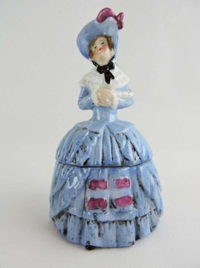 German Figural Porcelain Powder Box – Lady in Blue and Violet With Bonnet