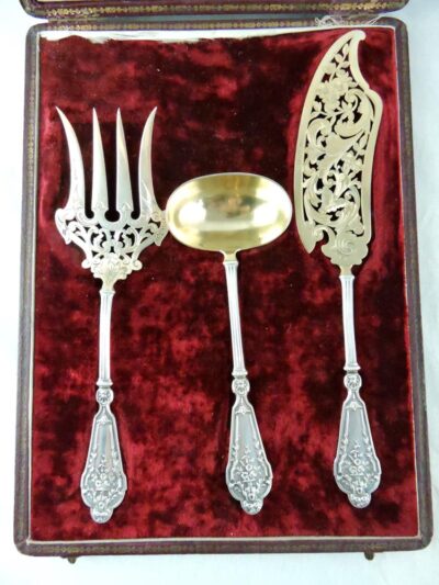 Set of 3 Serling Silver French Fish Servers With Fitted Leather-Bounded Box