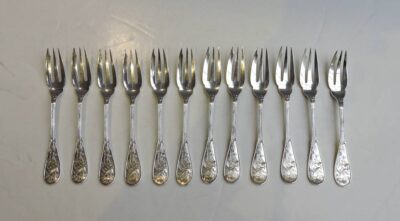 RARE EARLY TIFFANY Set of 12 STERLING SILVER Pastry Forks in Japanese Bird Pattern (Audubon)