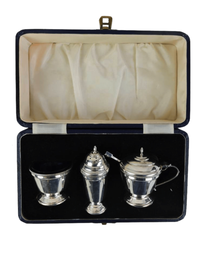 English Sterling Silver Boxed 3 Piece Condiment Set – Open Salt w/ Blue Liner, Pepper Shaker & Mustard Pot w/ Spoon – Birmingham 1921