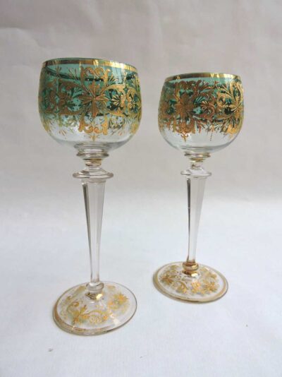 Pair of Austrian Moser Stemmed Crystal Wine Glasses with Raised Gold – 19th Century