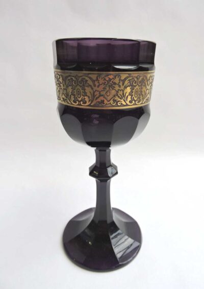 Signed Moser Karlsbad Acid Etched Gilt Banded Amethyst Crystal Goblet c. 1918-1922