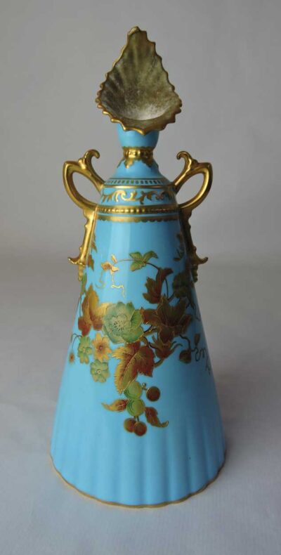 Royal Crown Derby – Turquoise Blue & Gilt Vase – Dated 1891. Unusual Tapered Shape.