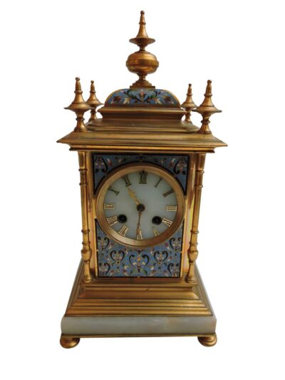 French Gilt Bronze Clock with Champleve Enamel Work and a White Onyx Face and Base
