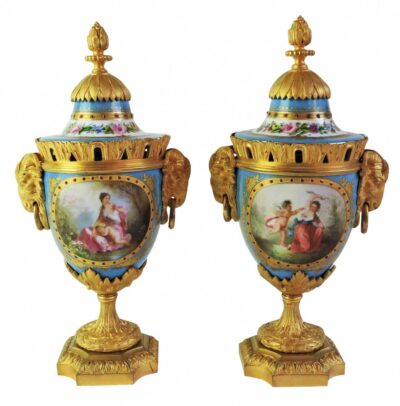 Pair of Beautiful Quality French Sevres Covered Porcelain and Gilt Bronze Urns.