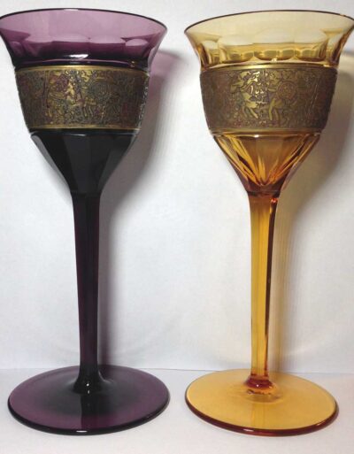 Pair of Moser Karlsbad Wine Glasses Acid Etched & Gold Banded dating 1918-1922 – One Amber, One Amethyst