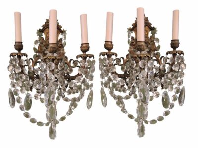 A Pair of Lion Mask Bronze Sconces with 3 Lights each and Hanging Crystals