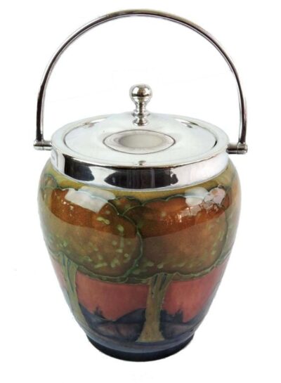 A RARE William MOORCROFT “EVENTIDE” BISCUIT BARREL w. Silver-Plate Lid, c. 1925