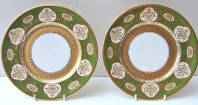 Pair Royal Doulton Cabinet Plates in Green with Heavy Gold work 10 1/2 inch diameter