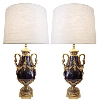 Pair of French Bronze and Cobalt Blue Porcelain Lamps – Swan Head Handles