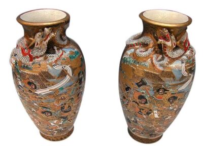 Pair of Meiji Period SATSUMA VASES With Figural Dragons and Samuri circa 1870