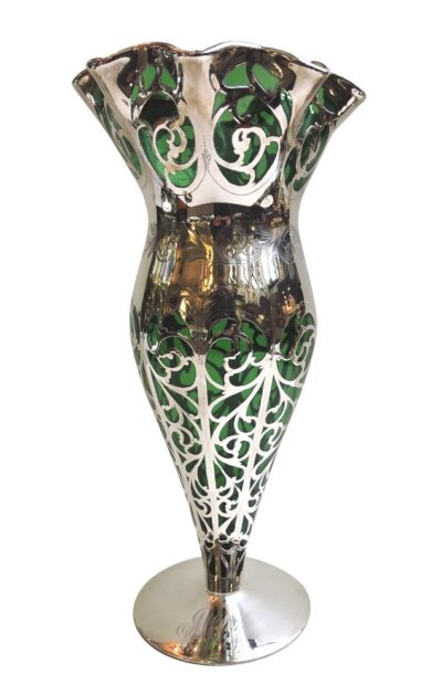 Large 14.5 inch American Silver Overlay Vase – Silver over Green. circa 1890