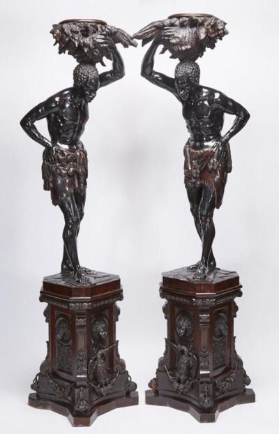 Pair 19th Century Italian Hand Carved – Life Size Ebonized Wooden Moor Figures on Stands.