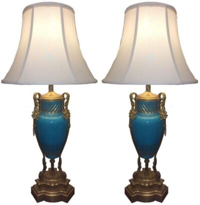 Pair of French Blue Porcelain and Bronze Lamps.