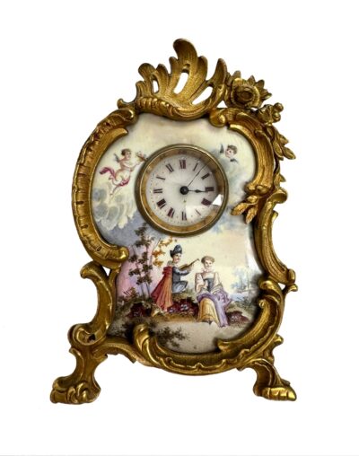 Viennese Miniature Gilt Bronze Clock with Lovely Hand Painted Enamelled Scenic Front.