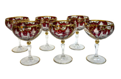 Set of 6 Bohemian Clear, Gilt & Etched Red Stemmed Glasses – with Deer & Castle Scenes.