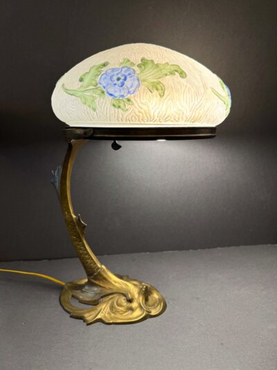 Art Nouveau Desk Lamp with Mold Relief Painted Shade with Bronze Fish Shape Base – Signed A. Eimann