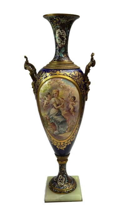 19th Century French Sevres Porcelain Two Handled Vase with Champleve Enamel Neck & Base. Signed “Rochette”