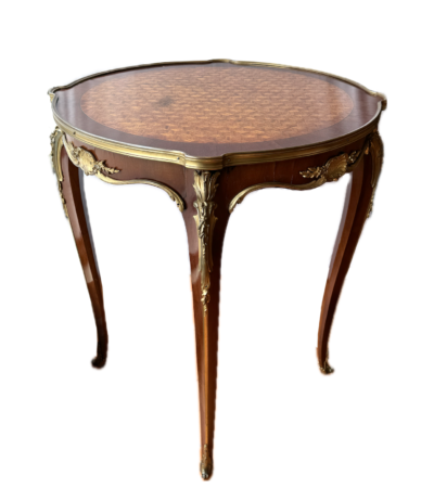 French Round Occasional Table with Parquetry Inlaid Top and “Ormolu” Gilt Bronze Mounts