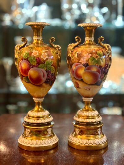 Exceptional Pair of Royal Worcester Hand Painted Fruit Pedestal Vases – J. Bowman & D. Whatmore – dated 1969
