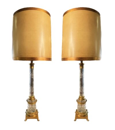 Pair of Austrian Neoclassical Style Cut Crystal and Ormolu Bronze Table Lamps, Mid century