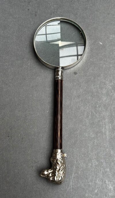 Silver Plated Magnifying Glass with Wood Handle and Dog Head Finial.