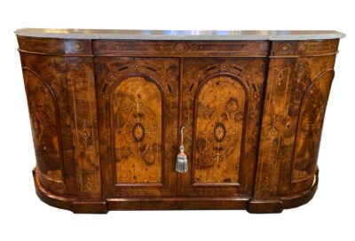 Victorian Burled Walnut Credenza with Satinwood Inlay and White Marble Top – circa 1860