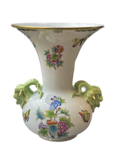 Herend, Hungarian Large Victoria Pattern Vase with Two Goat Head Handles – 10 inches tall.