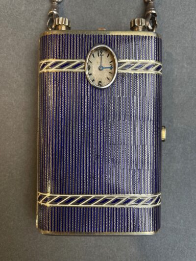 Art Deco German Indigo Blue and White Enamelled .935 Gilt Silver Compact Purse with Inlaid Clock and “Jewelled” Clasp, circa 1920