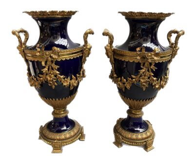 Exceptional Pair of Large French Blue Porcelain and Ormolu Mounted Vases circa 1850
