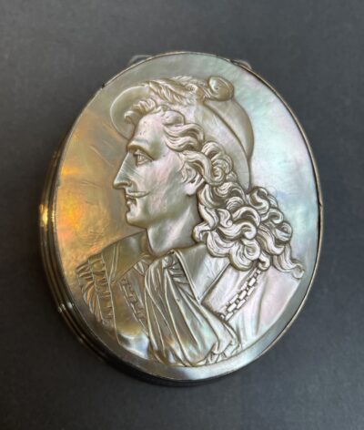 London England 1893 Hallmarked Silver Oval Box with Carved Mother of Pearl Portrait Cameo Hinged Lid, maker: C. Joshua Vander