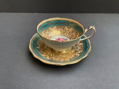 Paragon Double Warrant Stamp – Cup and Saucer with Teal Blue, Gold and Floral Interior.