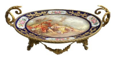 Sevres France Hand Painted and Gilded Porcelain Footed, Oval Tazza with Bronze Ormolu Mounts, signed Bombois