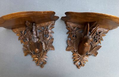 Pair of Black Forest Germany Elaborately Carved Wooden Wall Shelves with “Deer & Foliage” Decorations