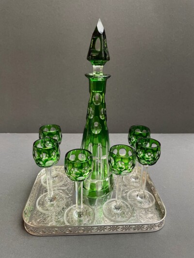 Bohemian Green and Clear Glass Liqueur Set (Decanter and 6 Stemmed Glasses)