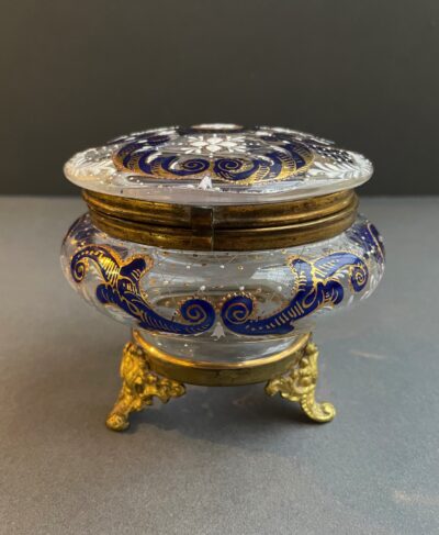 Austrian Enamelled Glass Footed Box with Hinged Lid – Blue, White & Gold Over Clear – circa 1880