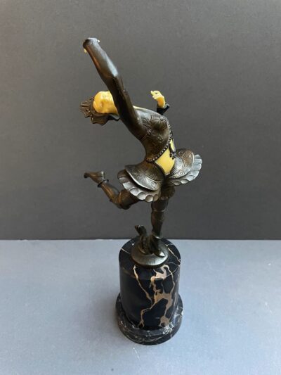 Italian Art Deco Bronzed Spelter and Faux Ivory Dancer Figurine, Attached Black and Veined Gold Marble Base
