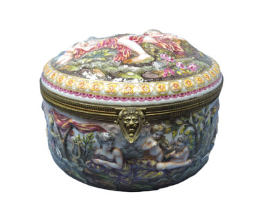Very Large Naples Porcelain Box with Putti and Women, c. 1900, Hinged Lid & Bronze Fittings with Lion’s Head Clasp