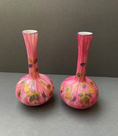 Pair of Vibrant Pink Satin Glass & Enamelled Floral Decorated Vases by Thomas Webb & Sons