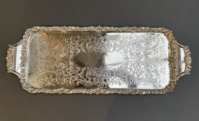 Long Old Sheffield England Silver-Plated Serving Tray, Embossed Florals and Engraving, 2 Handles, c. 1920