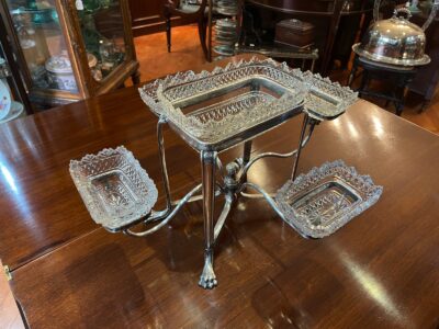 English Sheffield Silver-plated Centerpiece/ Epergne with Stoubridge Glass Insert Bowls – mid 19th Century.