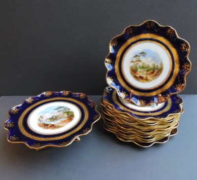 Early Aynsley English Dessert Set for 10 Plus Compote, Each Centre with Hand Painted Landscapes & Cobalt Blue & Gold Borders