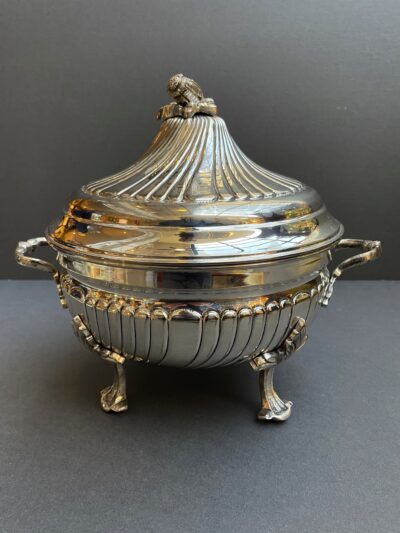 Silver-Plated, Two-Handled, Four- Footed Tureen with Removable Lid, Elaborate Finial, Leaf Decoration on Feet & Handles