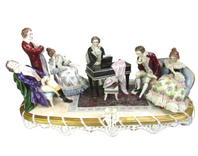 Large 22 inch German Sitzendorf Porcelain 6 Figural Grouping – Piano Player & 5 Other Figures as His Audience