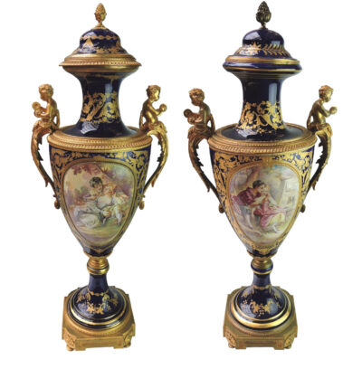 Pair of Large Hand Painted Mid-19th Century Sevres Vases with Mounted Gilt Bronze Hardware.