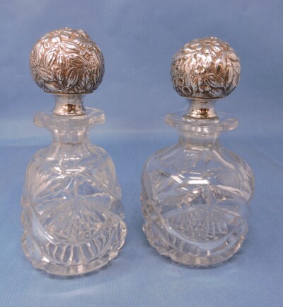 Pair Gorham Repoussé Sterling Silver & Crystal – Large Perfume Bottles c. 1900