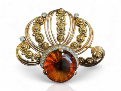 Elegant Early Birks Large Citrine Gemstone & Diamond Brooch, 14K Gold with 20 Diamonds – circa 1910