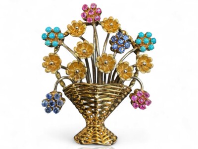 Exceptional Italian Jewelry by Designer Aldo Garavelli 18K Yellow Gold & Multi Gemstone Gardinetto (Flower Basket) Brooch, Mid 20th Century