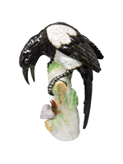 KPM, Berlin Germany Polychrome Painted Porcelain Figurine of “Magpie with Snail”, Originally Sculpted by Johann Baptist Pedrozzi