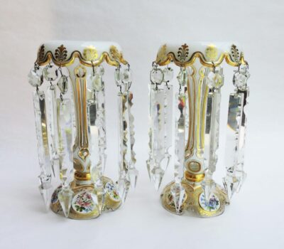 A Pair of 19th Century Bohemian Lustres – White Cut to Clear with Hand Painted Bouquets & Hand Gilding